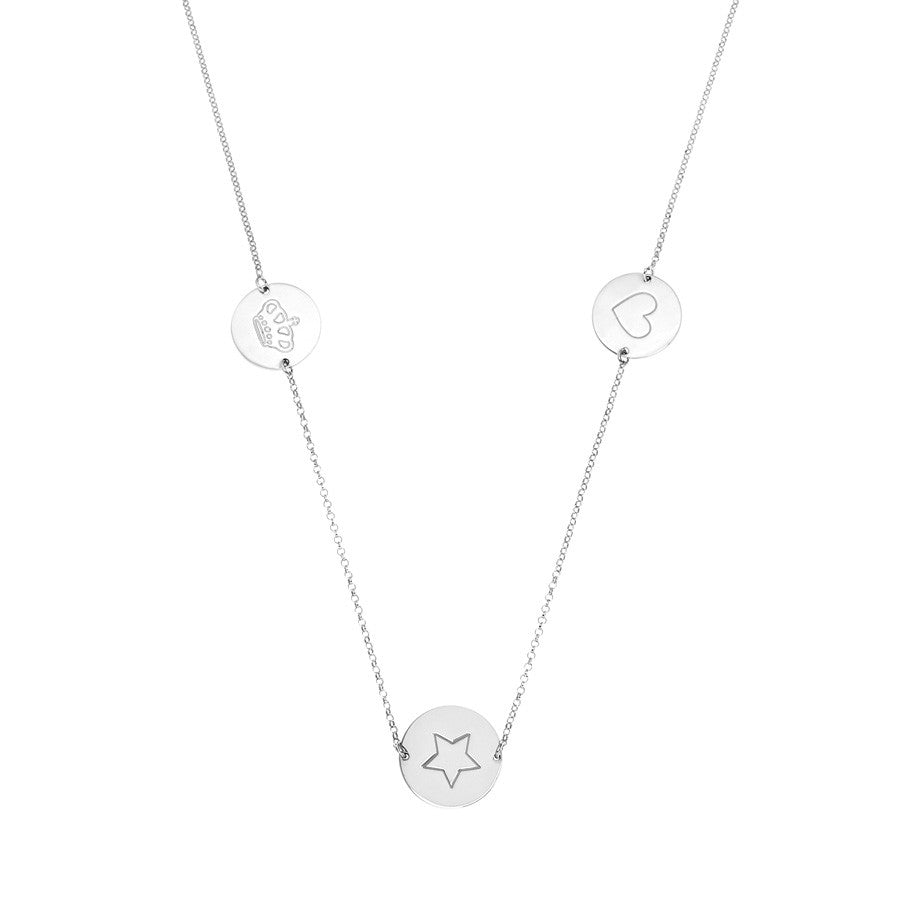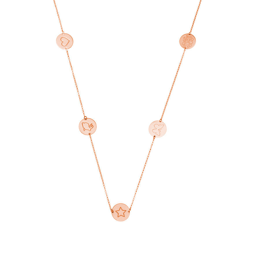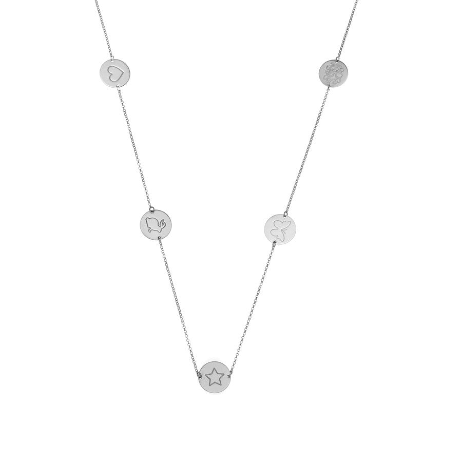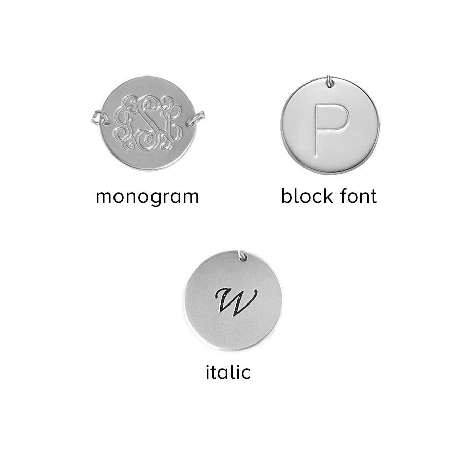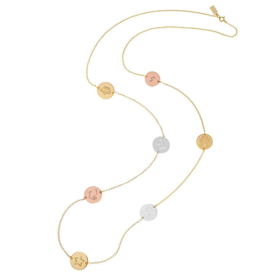 Put your stamp on this Engraved Charm Necklace – the chicest way to personalise your style by a long chalk. Engrave initials, monograms, words, names or even symbols onto your choice of disc finish, and have up to 7 discs hanging around your 30 inch chain.