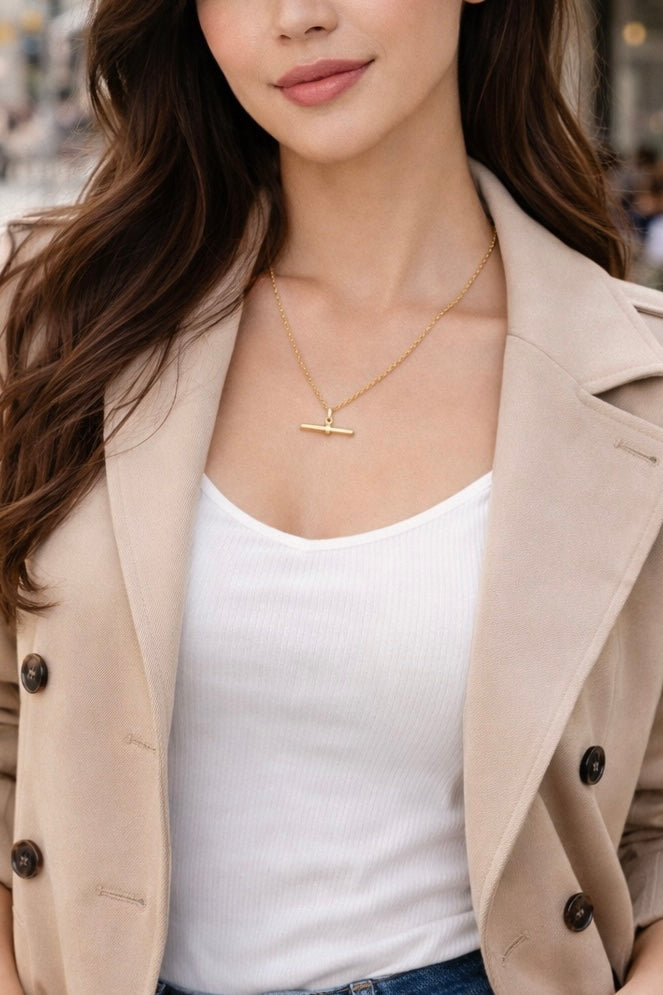 A classic pendant loaded with style. Stunning necklace with a T-Bar and statement chain. Simple, stylish, and very much on-trend.